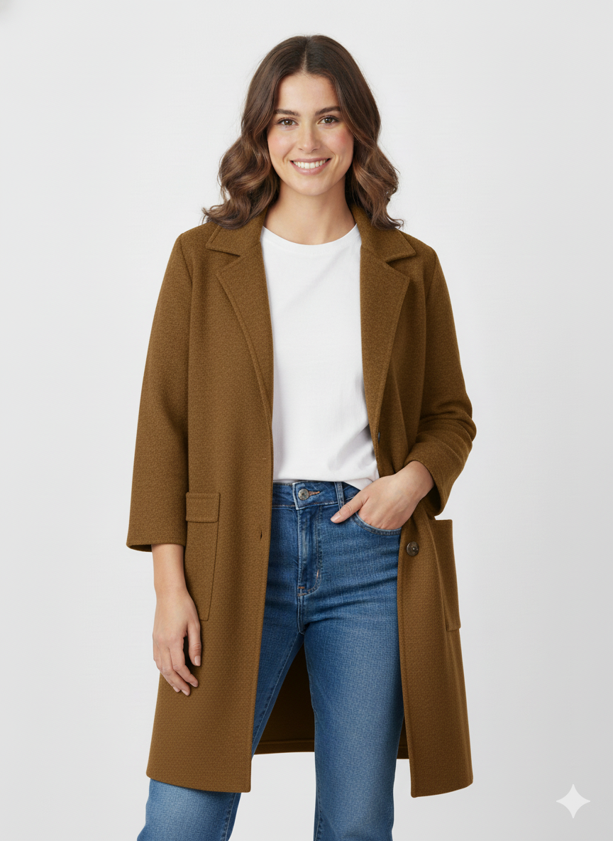 Abrigo de punto en color caramelo con cuello y botones de nacar hasta arriba con dos bolsillos grandes en la parte delantera.