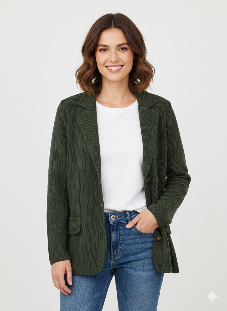 Blazer tejido punto en color verde kaki, cuello solapa y botones de cuero, con dos bolsillos delanteros.