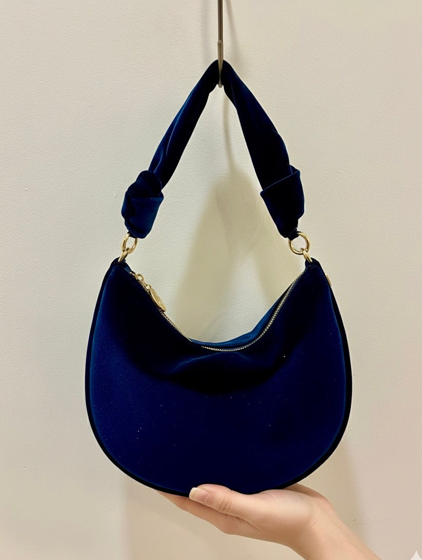 Bolso teciopelo tamaño mediano ( 29x 23 x 10 cms.) con asa corta en terciopelo con nudos en los extremos. LLeva cierre de cremallera y bolsillo interior. Opcional se puede encargar bandolera lara en cadena dorada, piel o terciopelo.