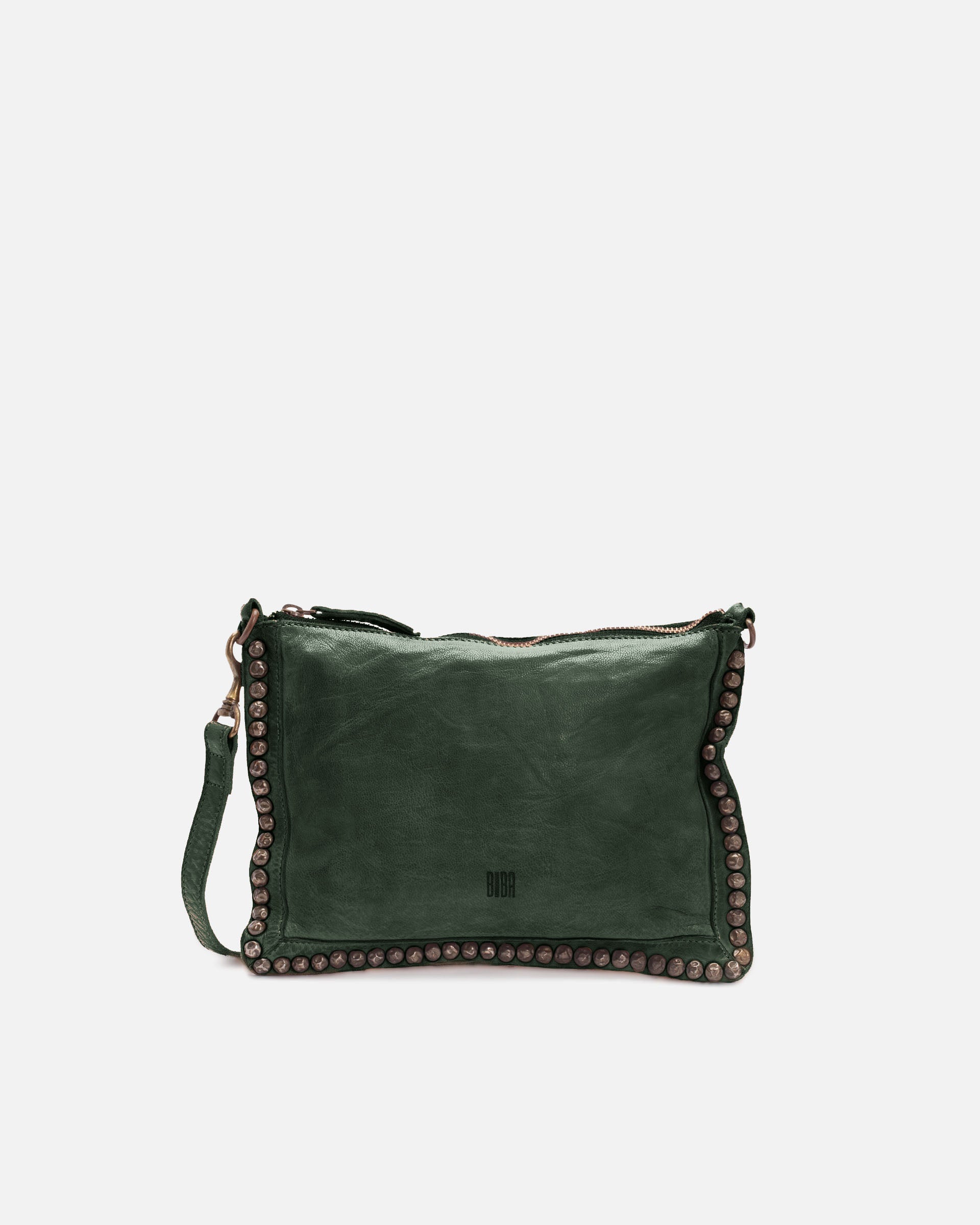 Cross bag de piel de oveja, lavada, y de curtición vegetal. Tachas en los bordes del bolso. Cierre con cremallera, bandolera ajustable y extraíble, bolsillos internos y externos, y forro de algodón.