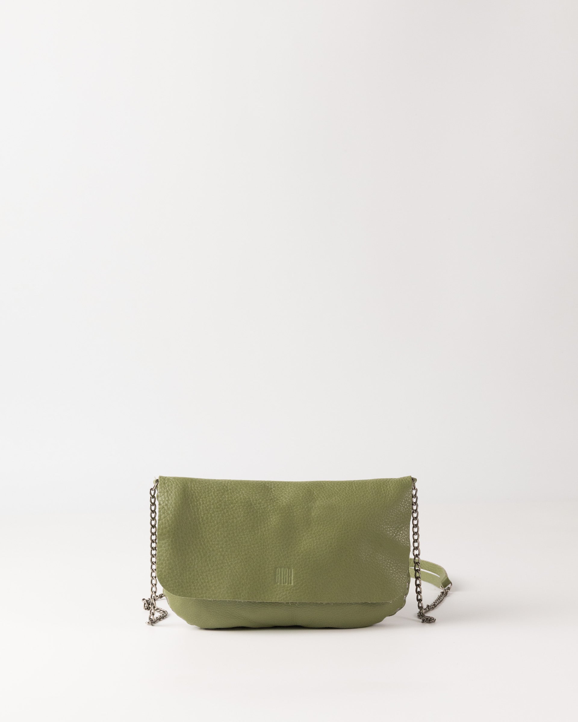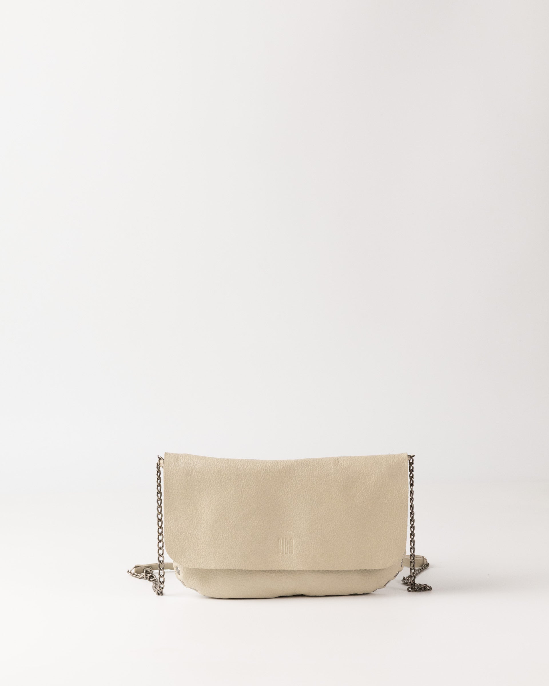 Bolso bandolera de de piel vacuna. Remaches decorativos en todo el borde del bolso. Cierre con solapa y cremallera. Bandolera regulable de piel y cadena. Bolsillo interno. Sin forro.