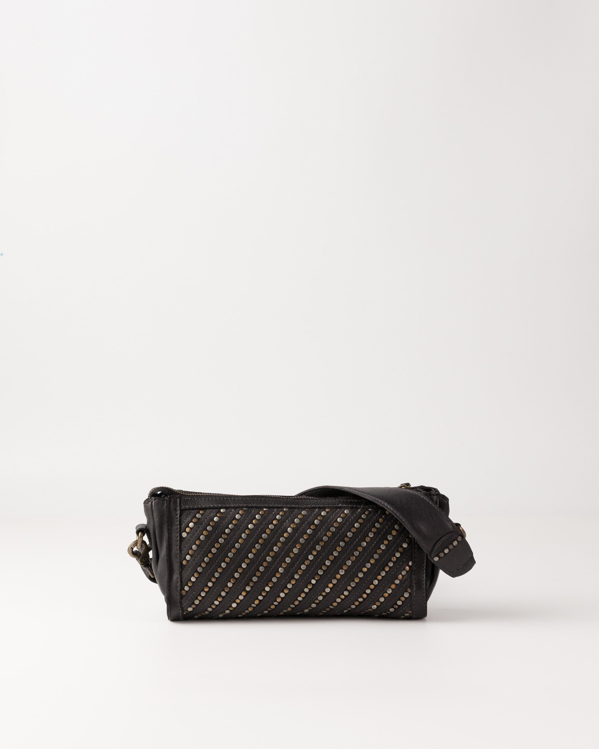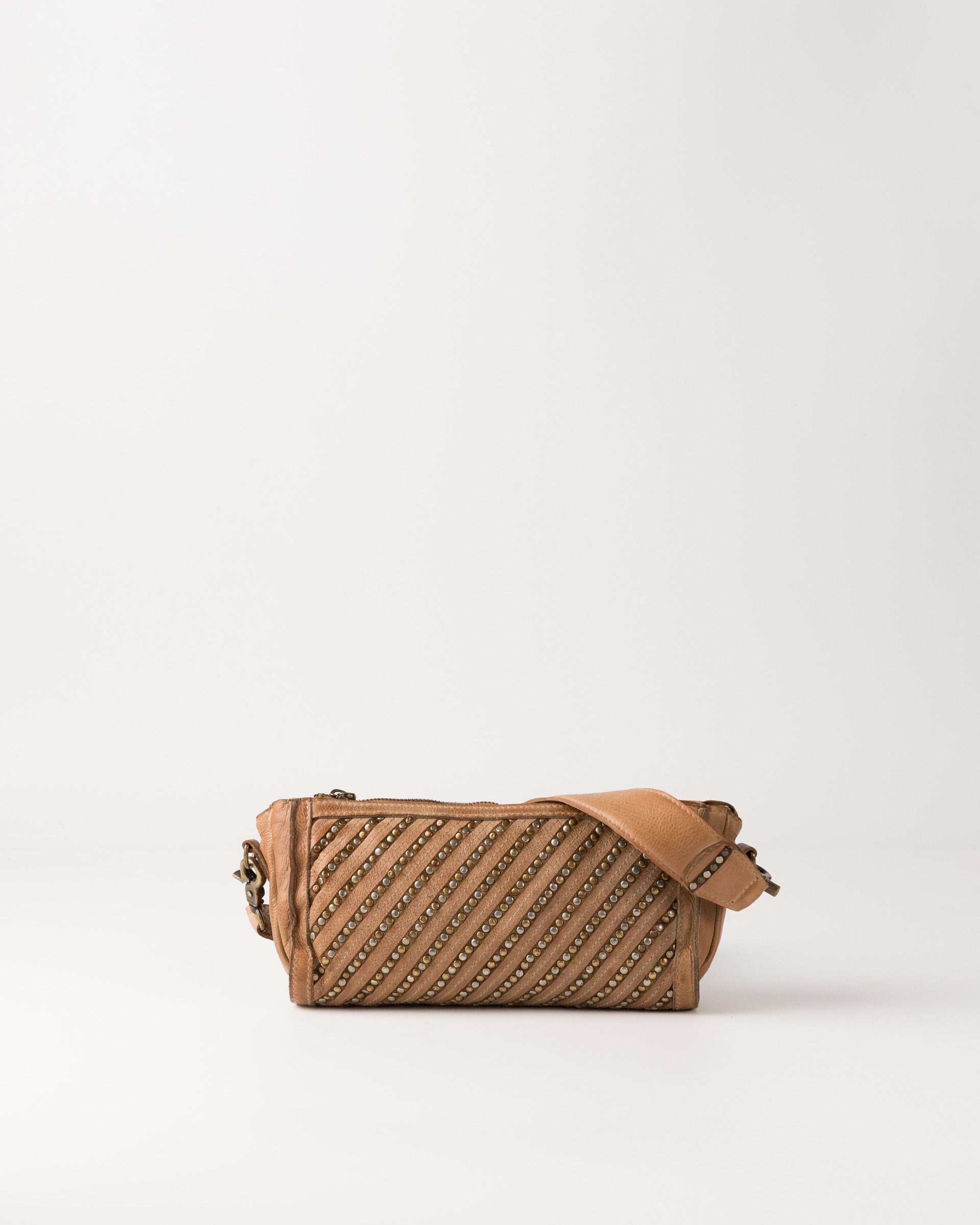 Bolso bandolera de piel vacuna lavada. Tachuelas decorativas en todo el bolso. Cierre con cremallera. Asa de hombro extraible. Bandolera regulable y extraible. Bolsillo interno. Forro de algodón.