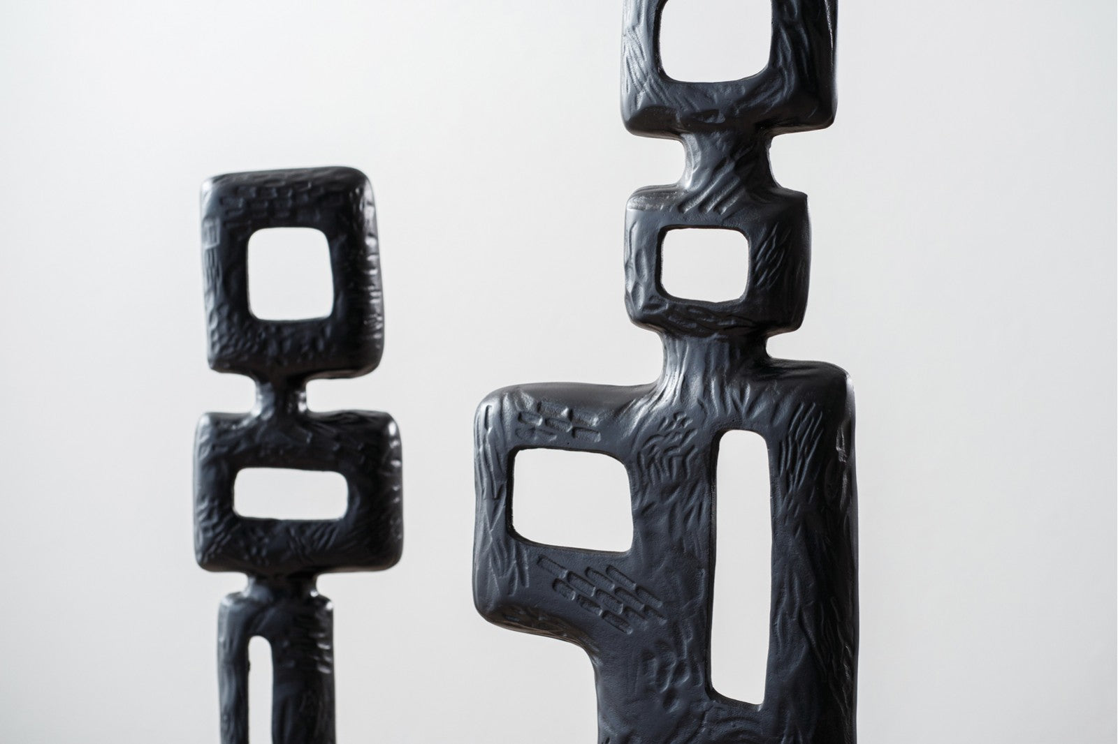 Escultura de metal negra, las medidas son de 29*19*127 cms.