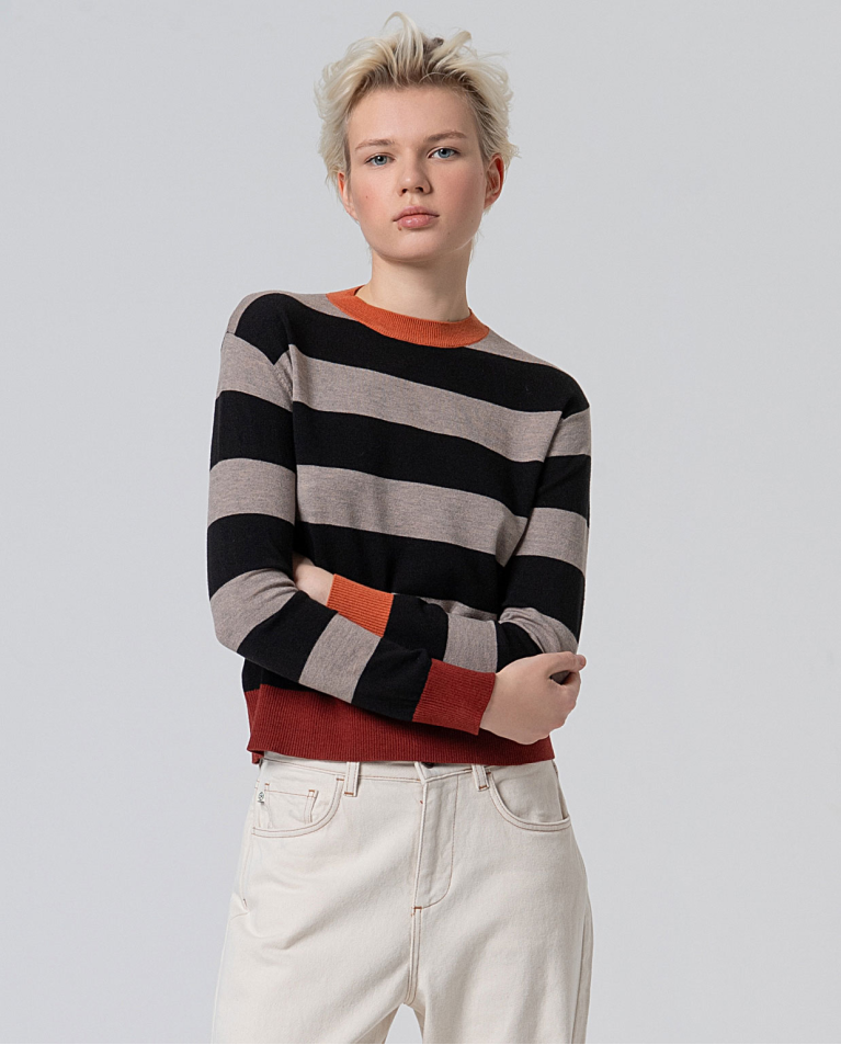 Jersey de punto con cuello redondo y rayas anchas multicolor. Un diseño fresco y lleno de energía, ideal para mujeres que buscan prendas cómodas, con calidad y un toque divertido. Su suavidad y elasticidad garantizan confort y estilo.