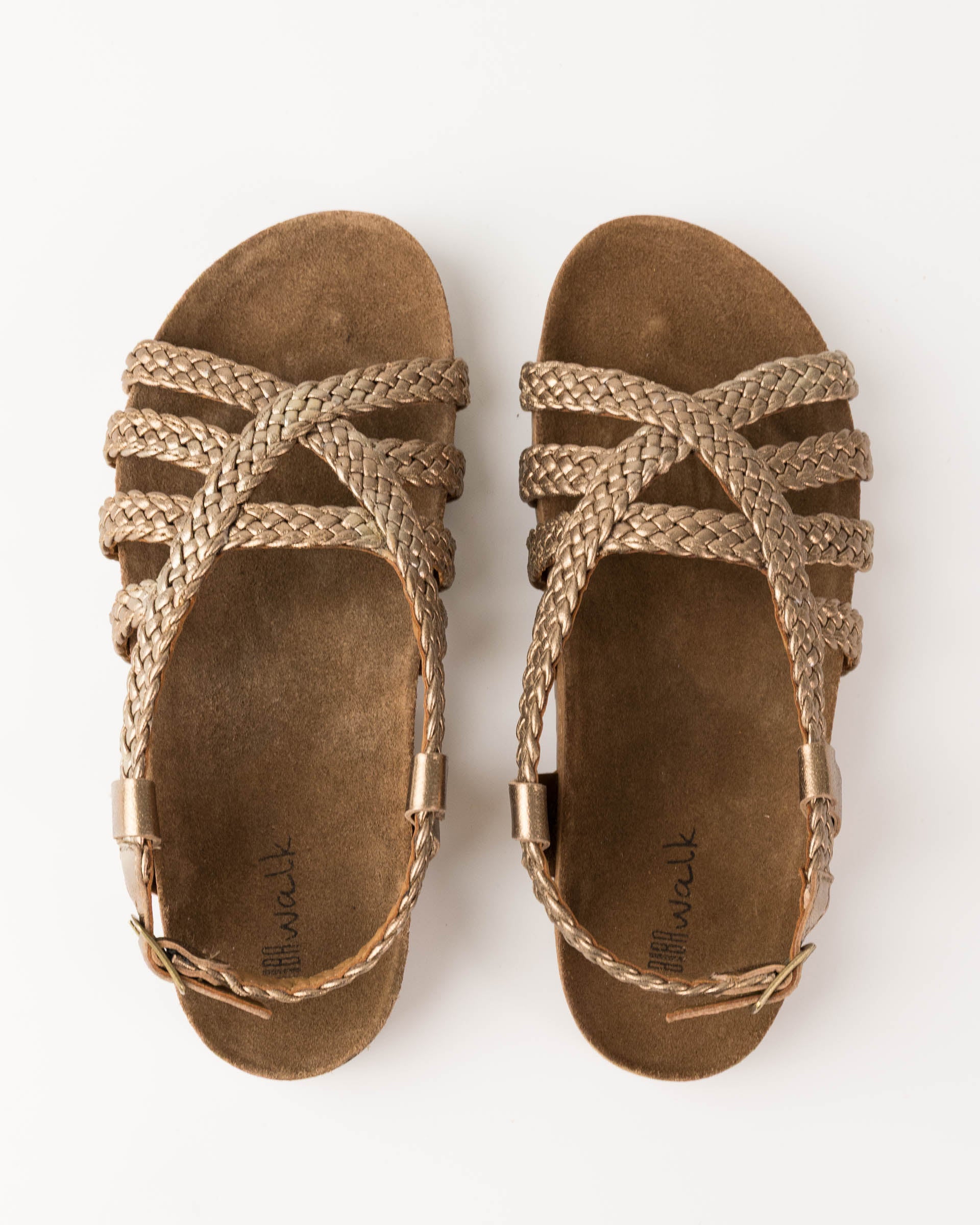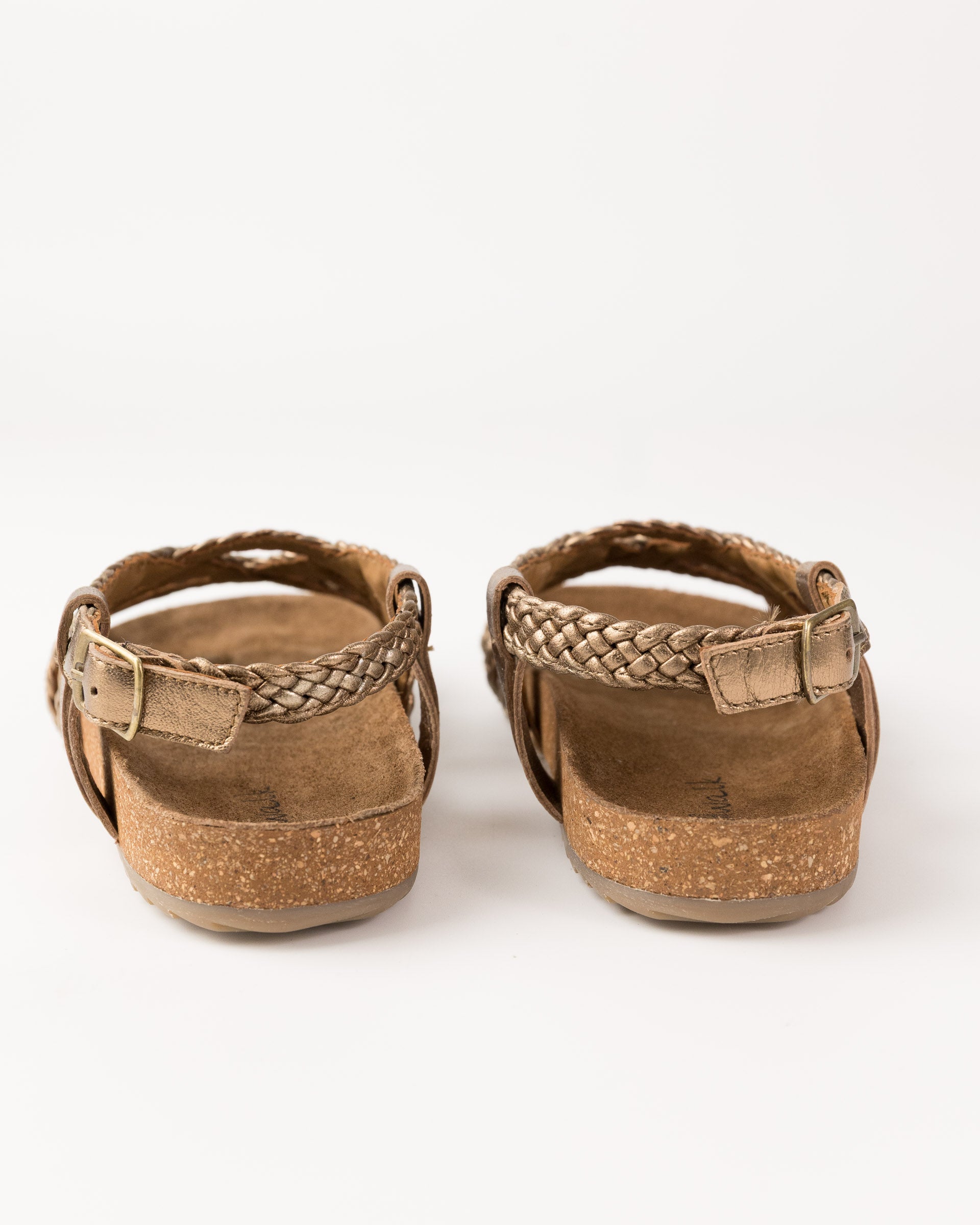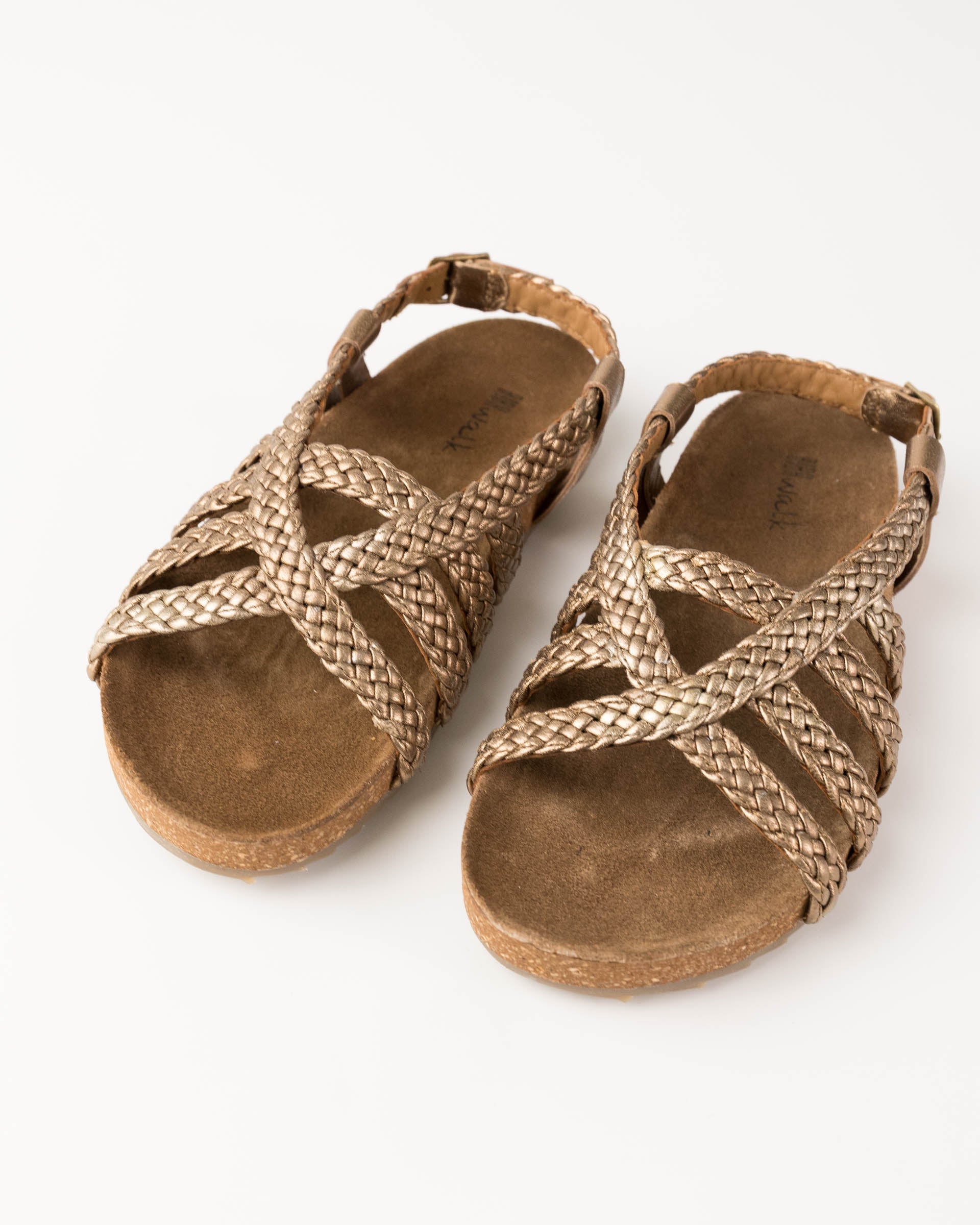 Sandalia de piel ovina trenzada. Plantilla de serraje y corcho, y suela de caucho antideslizante. Tiras de piel trenzada, y tira de sujecion en el talon.