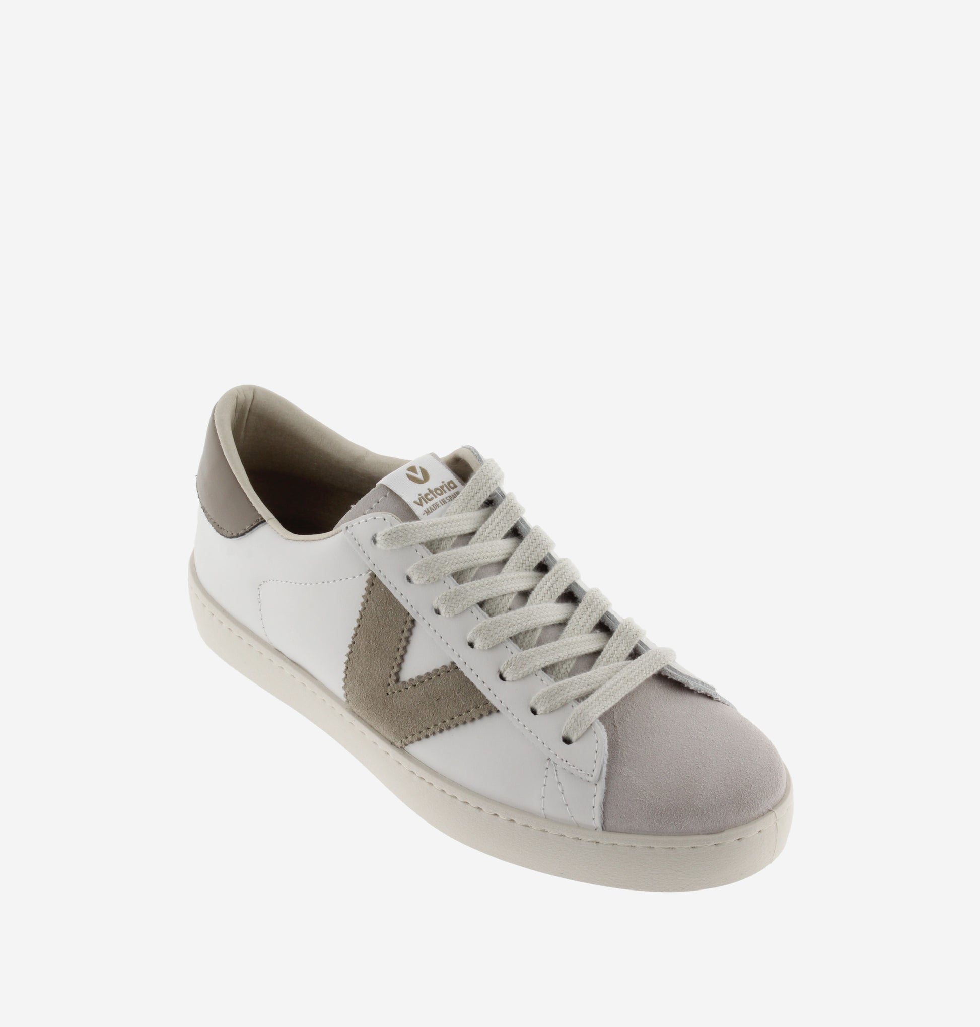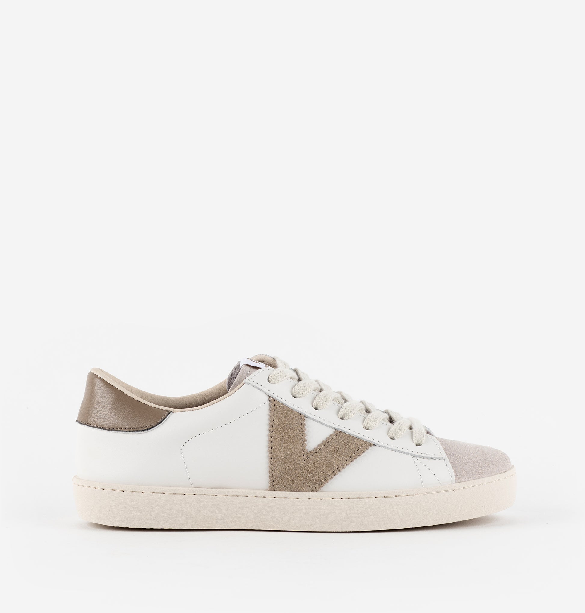 Zapatillas de piel blanca con puntera de serraje (certificado LWG). El logitopo de victoria lateral y la pieza trasera en colores a juego hacen contraste. Cómoda suela de PVC a base de aceites vegetales, ligeramente tostada. Modelo sostenible Dear World. Made in Spain.